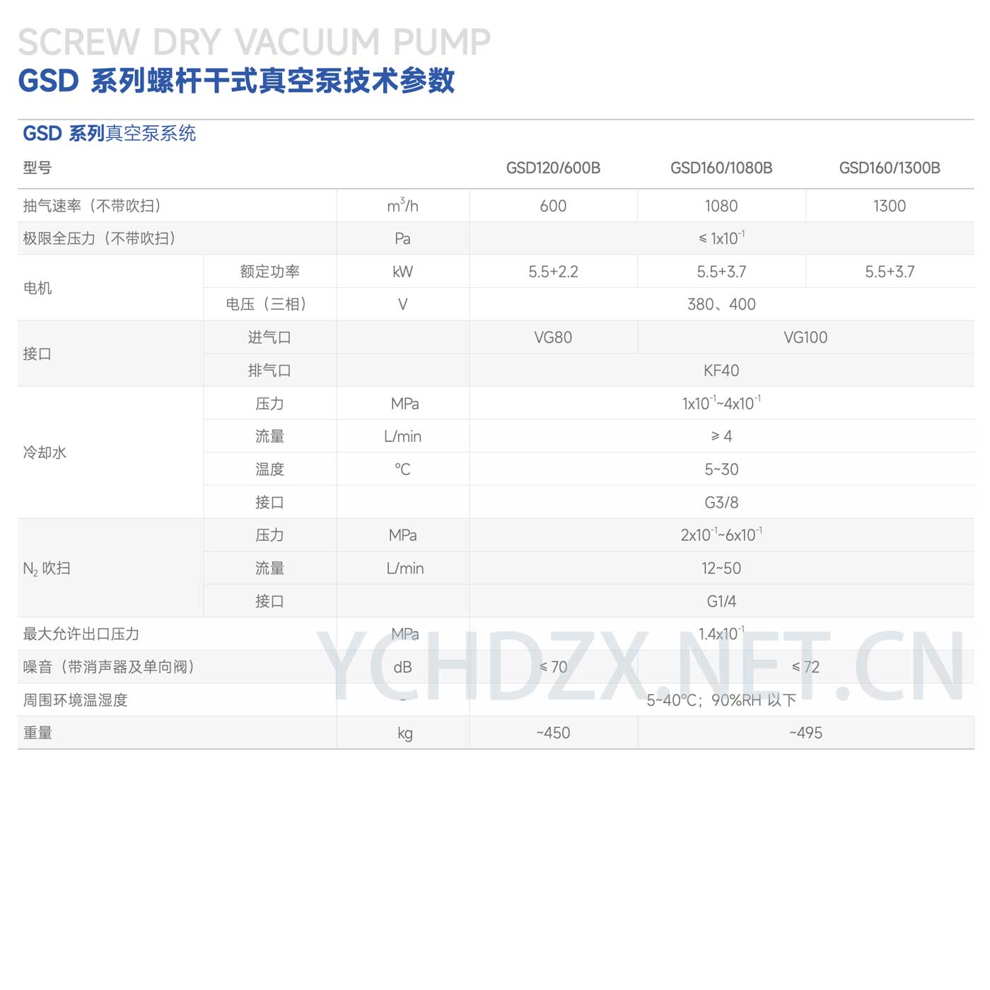 GSD120/600B真空泵广泛应用于冶金、镀膜、干燥、真空室排气、等离子工艺、太阳能光伏等领域[1]。其主要性能指标包括抽气速率600 m³/h,极限全压力≤1x10⁻¹ Pa,电机额定功率5.5+2.2 kW,三相电压380/400 V,噪音(带消声器及单向阀)≤ 70 dB,周围环境温湿度-5~40℃;90%RH以下,重量约450 kg[2]。